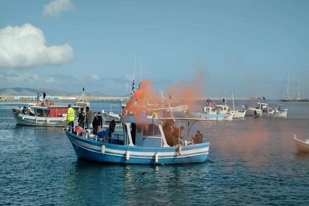Εκεί, τους αγρότες, κτηνοτρόφους και μελισσοκόμους περίμεναν οι αλιείς του Ηρακλείου. Με μαύρες σημαίες στα καΐκια τους, απέκλεισαν το λιμάνι και άναψαν βεγγαλικά θέλοντας να καταδείξουν την δεινή θέση στην οποία έχει περιέλθει η αλιεία στο νησί.