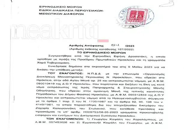 Η Μονή, σύμφωνα με την ιστοσελίδα neakriti.gr, προσέφυγε δικαστικά όταν δεν αποδόθηκαν τα κτήματα και κέρδισε αφενός να θεωρηθεί από το δικαστήριο ότι είναι ο νόμιμος κάτοχος, αφετέρου να υποχρεώσει τους κτηνοτρόφους να εγκαταλείψουν τα στρέμματα που ιδιοποιούνταν στην περιοχή “Δυτική Αγκινάρα…” στα Πηγαϊδάκια. Η αγωγή για την οποία εκδόθηκε απόφαση αφορά κτηνοτρόφους από την περιοχή της Γέργερης.