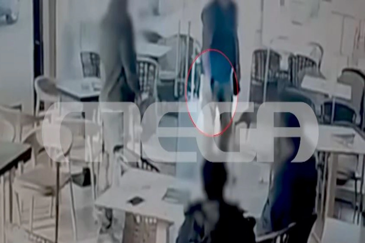 Στη συνέχεια, ο ένοπλος τραβάει μία καρέκλα και παίρνει στα χέρια του ένα τσαντάκι που βρισκόταν πάνω της. Χωρίς να το σκεφτεί, πυροβολεί στο έδαφος.