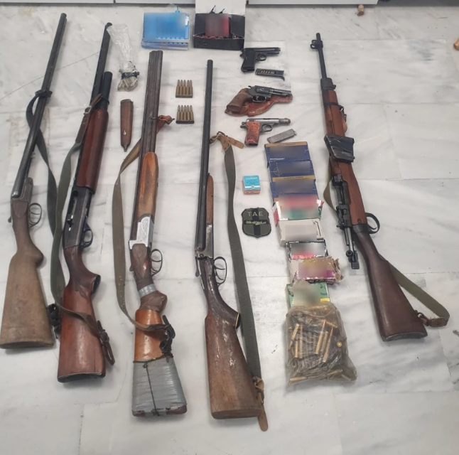 Κατά την διάρκεια των ερευνών, βρέθηκαν συνολικά ένα πολεμικό τυφέκιο, τέσσερα κυνηγετικά όπλα, δύο πιστόλια, ένα περίστροφο, γεμιστήρες, 595 φυσίγγια διαφόρων τύπων και διαμετρημάτων και μια δερμάτινη θήκη πιστολιού. Τα παράνομα όπλα κατασχέθηκαν και τα πυροβόλα παραδόθηκαν στα εγκληματολογικά εργαστήρια για να γίνει βαλλιστική εξέταση.