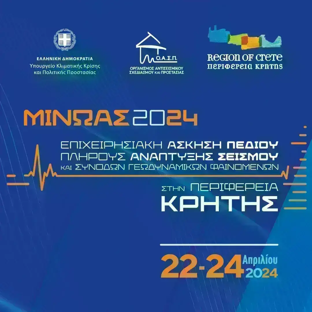 EXERCISE – EXERCISE – EXERCISE – MINISTRY FOR CLIMATE CRISIS AND CIVIL PROTECTION 22/04/2024 – TIME (…) – A strong earthquake in the Regional Units of Chania and Rethymno – Start of earthquake exercise MINOAS 2024. EXERCISE – EXERCISE – EXERCISE»
