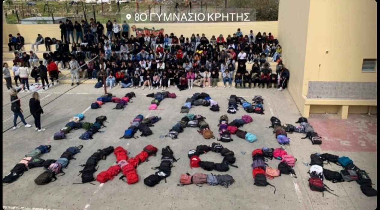 Παράλληλα, σε μία αυθόρμητη κίνηση, όπως συνηθίζεται τελευταία, με τους σάκους και τις σχολικές τσάντες σχημάτισαν τη φράση “Ήταν η κακή η (χ)ώρα”!