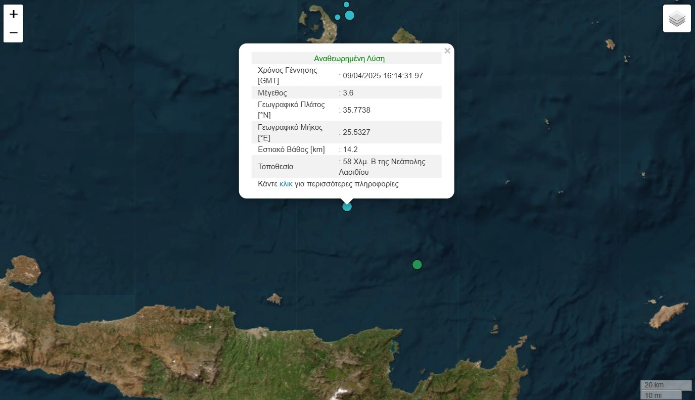 Σύμφωνα με την ανακοίνωση που εξέδωσε το Γεωδυναμικό Ινστιτούτο του Εθνικού Αστεροσκοπείου Αθηνών, ο σεισμός προέρχεται από τον θαλάσσιο χώρο που βρίσκεται σε απόσταση 58 χιλιομέτρων βόρεια από την περιοχή της Νεάπολης στο Λασίθι.