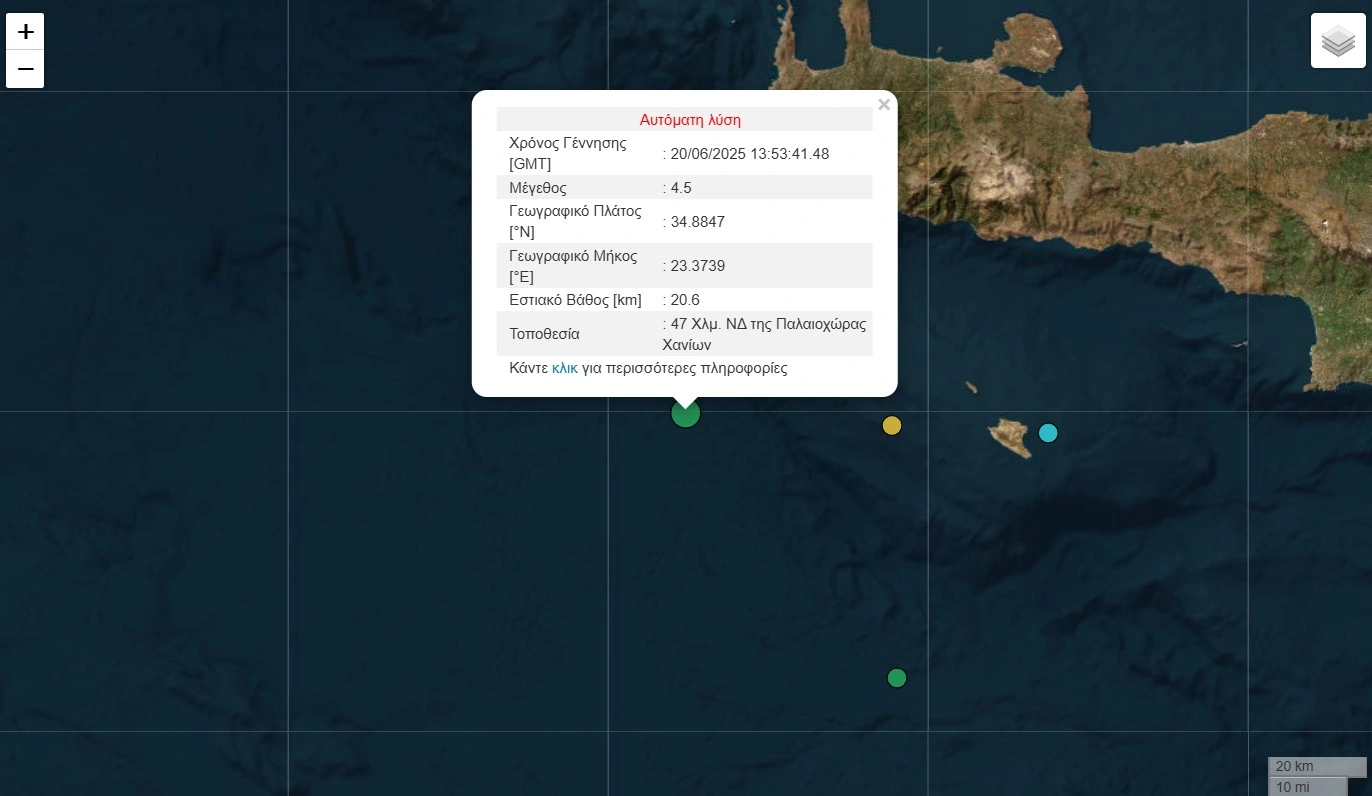 Ο σεισμός είχε εστιακό βάθος 20,6 χλμ. και εκδηλώθηκε 47 χλμ. νοτιοδυτικά της Παλαιοχώρας Χανίων.