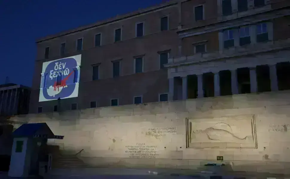 Σύμφωνα με σχετική ανακοίνωση της Βουλής, το σήμα-σύμβολο με το οποίο φωταγωγήθηκε το Μέγαρο του κοινοβουλίου, δημιουργήθηκε από τον συγγραφέα, Νίκο Δήμου, το πρωί της 14ης Αυγούστου 1974, ημέρα, που με την εισβολή του «Αττίλα» διχοτομήθηκε η Κύπρος, με το 37% των εδαφών της μέχρι σήμερα να παραμένει υπό τουρκική κατοχή. Το «ΔΕΝ ΞΕΧΝΩ» συμπυκνώνει, οδυνηρά, όλη την Κυπριακή τραγωδία, μισό αιώνα μετά και παρότι η μαρτυρική Μεγαλόνησος ανήκει πλέον στην Ευρωπαϊκή Ένωση. Το εμβληματικό σήμα τυπώθηκε σε χιλιάδες αυτοκόλλητα, αντίτυπά του στάλθηκαν στις εφημερίδες, το σύνθημα «ΔΕΝ ΞΕΧΝΩ» μεταφράσθηκε σε πολλές γλώσσες και στάλθηκε σε πολλά μέρη του κόσμου όπου υπήρχαν Έλληνες (Ελλαδίτες και Κύπριοι) φοιτητές.