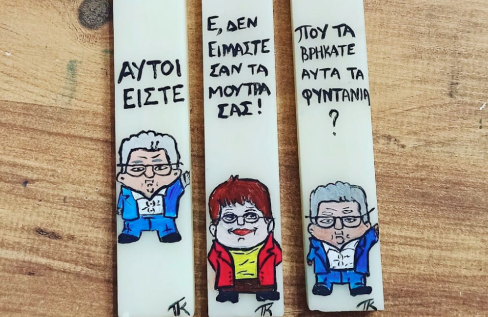 Το εργαστήρι «Το λειρί του Κόκορα» έφτιαξε λαμπάδες με τον Δημήτρη Κουτσούμπα και με ατάκες του που «έγραψαν» όπως το «αυτοί είστε», «που τα βρήκατε αυτά τα φυντάνια» κλπ και τελικά οι λαμπάδες γίνανε ανάρπαστες.