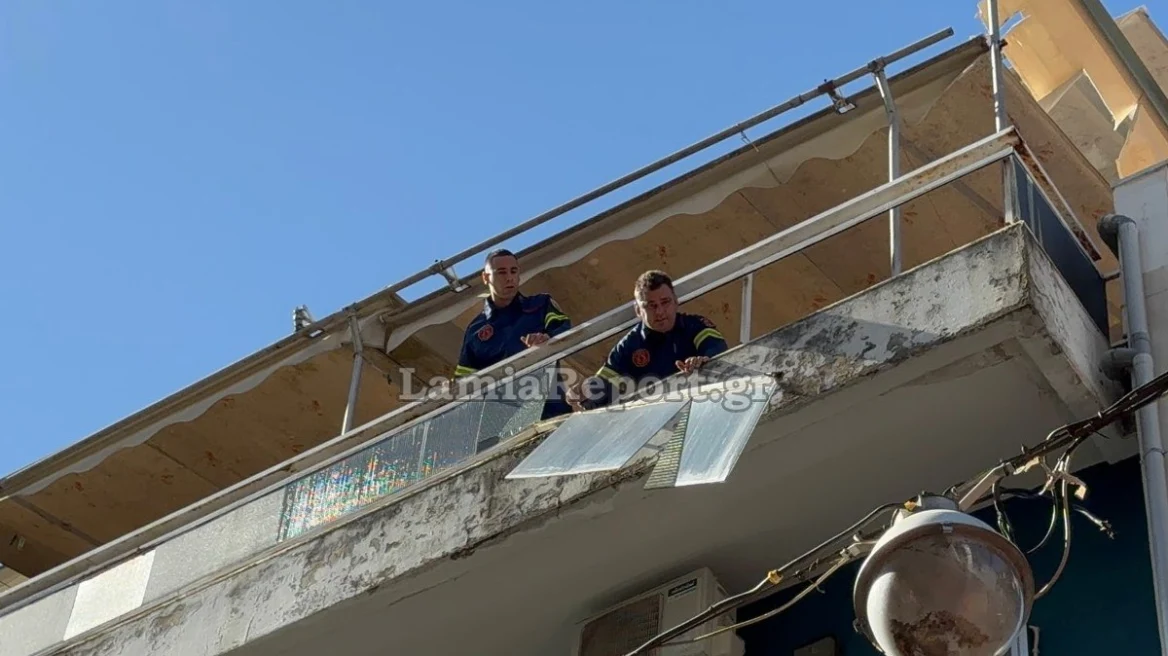 Μεγάλο κάγκελο με τζάμια κρεμόταν από μπαλκόνι στη Λαμία – Δείτε βίντεο και φωτογραφίες