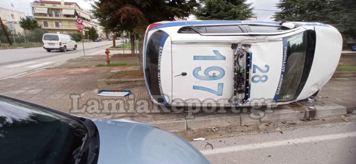 Μετά τη σύγκρουση το περιπολικό “απογειώθηκε” και κατέληξε τουμπαρισμένο πάνω στο πεζοδρόμιο, όπως ακριβώς το βλέπετε στις φωτογραφίες του LamiaReport.