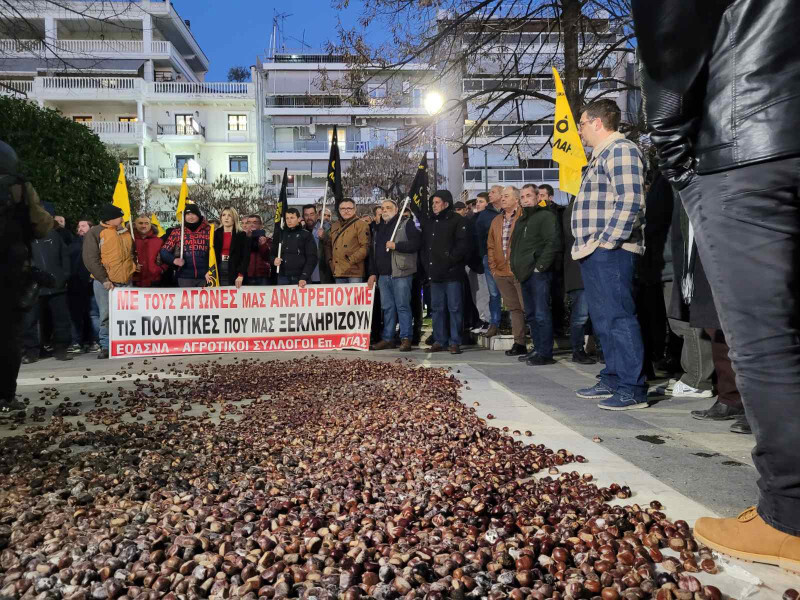 Μάλιστα, όπως αναφέρει το ρεπορτάζ της ιστοσελίδας onlarissa.gr οι αγρότες σκόρπισαν σε ένδειξη διαμαρτυρίας κάστανα, μπροστά από την έδρα της Περιφέρειας Θεσσαλίας.