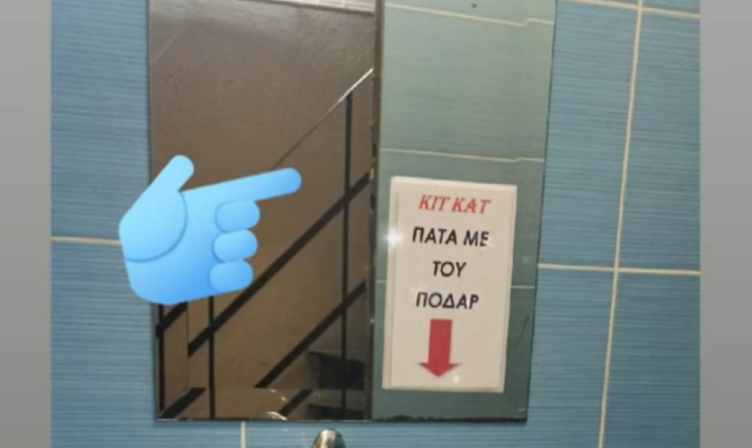 Το αυτοσχέδιο σημείωμα πάνω από τον νιπτήρα δίνει οδηγίες στους πελάτες για το πώς λειτουργεί η βρύση σε άπταιστα… λαρισαϊκά: «Κιτ κατ. Πάτα με του ποδάρ…».