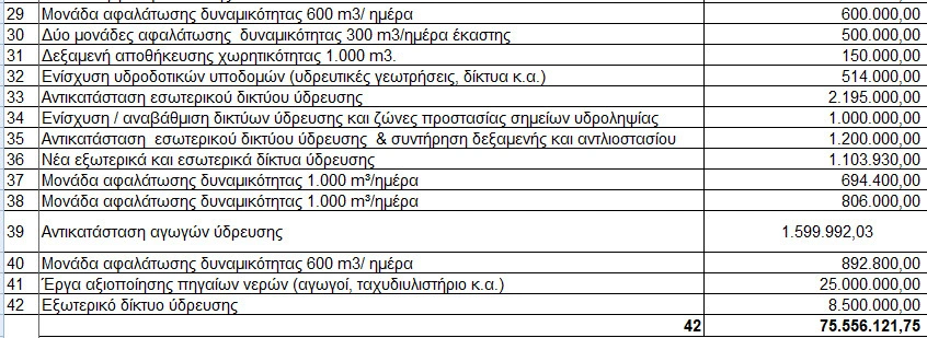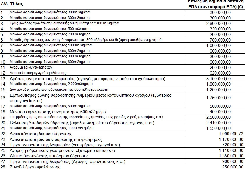Το ποσό δεσμεύθηκε από το Τομεακό Πρόγραμμα Ανάπτυξης 2025 του Υπουργείου Περιβάλλοντος και Ενέργειας και αφορά, μεταξύ άλλων, στη δημιουργία και τον εκσυγχρονισμό μονάδων αφαλάτωσης, στη βελτίωση και αντικατάσταση δικτύων ύδρευσης, σε δράσεις αξιοποίησης πηγαίων νερών (αγωγοί, ταχυδιυλιστήρια) κ.ά.
