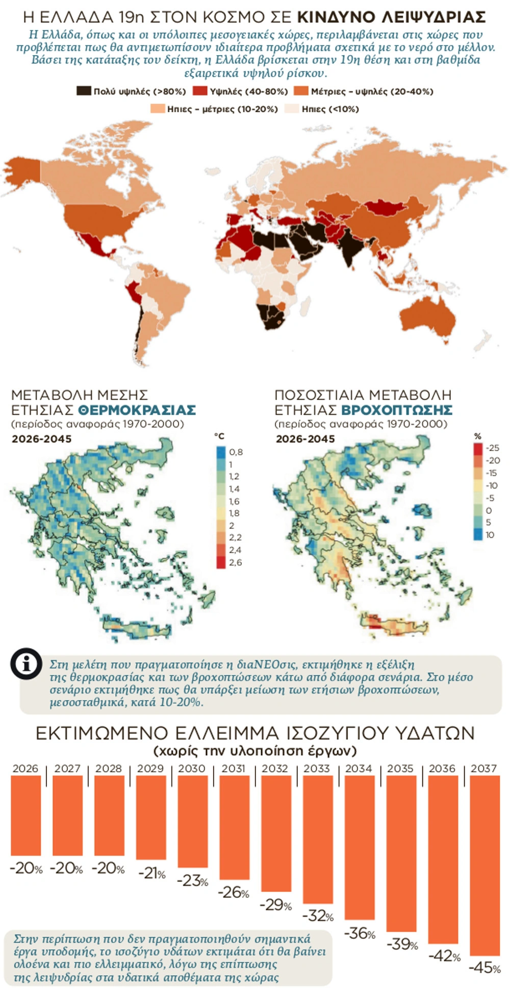 Χθες πραγματοποιήθηκε σύσκεψη για το θέμα της λειψυδρίας στο Μέγαρο Μαξίμου, ενώ παρουσιάστηκε ο εθνικός σχεδιασμός για την αντιμετώπισή του. Οπως έγινε γνωστό, η Ελλάδα βρίσκεται στη 19η θέση ως προς τον κίνδυνο λειψυδρίας, δεδομένου ότι η στάθμη των φραγμάτων βρίσκεται σε ιστορικά χαμηλά επίπεδα, τα οποία μάλιστα έχουν μειωθεί στην Αττική σε σχέση με το 2022 στο 50%.