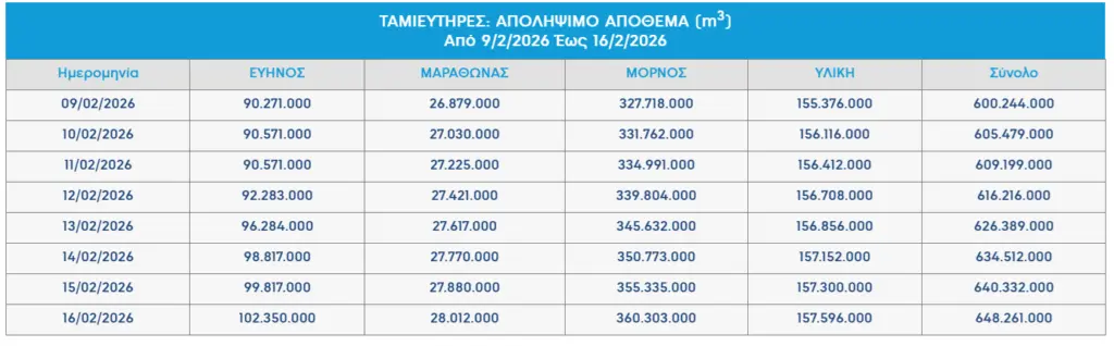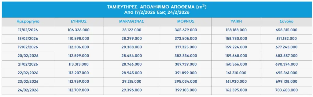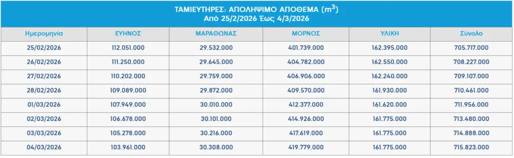 Σύμφωνα με τα δεδομένα απολήψιμων αποθεμάτων της ΕΥΔΑΠ, οι τέσσερις ταμιευτήρες της πρωτεύουσας έφτασαν την Τετάρτη (4/3) τα 715.823.000 κυβικά μέτρα νερού, από 399.736.000 την Πρωτοχρονιά του 2026, ξεπερνώντας τα επίπεδα του 2025. Η τελευταία φορά που τα αποθέματα ήταν πάνω από το «όριο» των 700 εκατ. κυβικών μέτρων ήταν τον Αύγουστο του 2024.