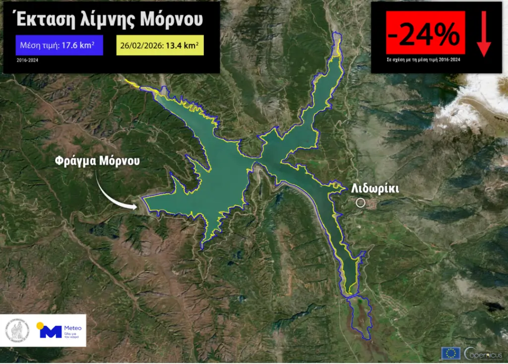 Και συνεχίζει: «Σύμφωνα με δορυφορικά δεδομένα υψηλής ανάλυσης (Sentinel-2) που επεξεργάστηκε η μονάδα ΜΕΤΕΟ του Εθνικού Αστεροσκοπείου Αθηνών, η έκταση της λίμνης του Μόρνου στις 21 Φεβρουαρίου 2026 ανέρχεται σε 13 km², με τη μέση τιμή του Φεβρουαρίου για την περίοδο 2006–2024, να είναι 17,6 km², δηλαδή περίπου 26% χαμηλότερη από τη μέση τιμή. Ενδεικτικά, στις περιοχές που τροφοδοτούν τους ταμιευτήρες Μόρνου-Ευήνου, τον Ιανουάριο σημειώθηκαν κατά τόπους ύψη βροχής υπερτριπλάσια του Ιανουαρίου 2025, ενώ για τον Φεβρουάριο οι καταγραφές δείχνουν ήδη ύψη ακόμα και πενταπλάσια από τα περσινά. Αυτό σημαίνει ότι για το επερχόμενο καλοκαίρι δεν αναμένεται άμεσος κίνδυνος για την υδατική μας επάρκεια. Παρά ωστόσο την ανάκαμψη από τις άφθονες βροχοπτώσεις που σημειώνονται στην Ελλάδα και στην περιοχή του Μόρνου, η έκταση της λίμνης παραμένει σε χαμηλά επίπεδα».