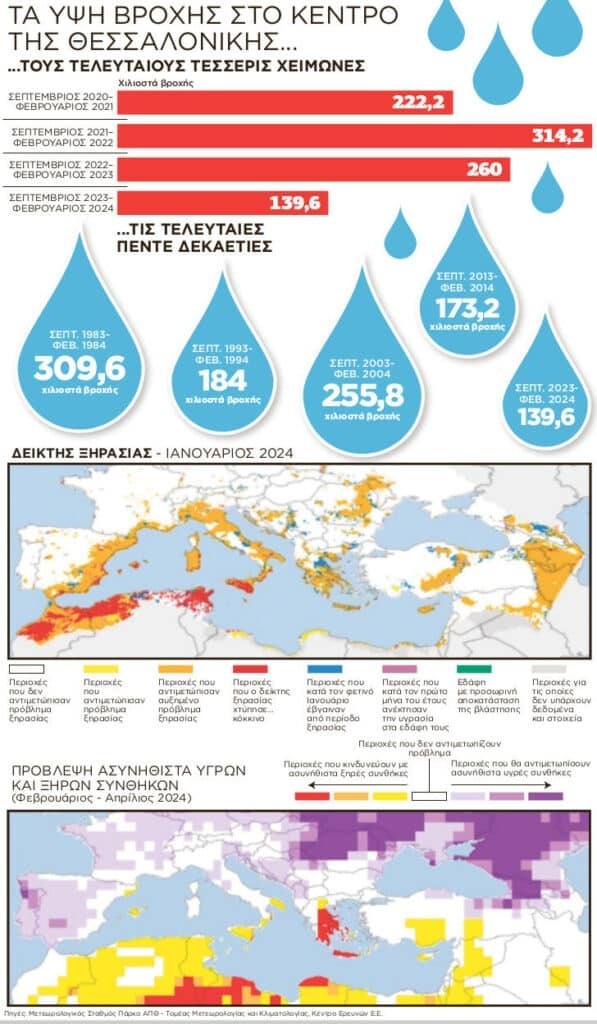 Πάντως, σύμφωνα με τις μετρήσεις του μετεωρολογικού σταθμού που λειτουργεί από το 1930 στο πάρκο του ΑΠΘ και ανήκει στον τομέα Μετεωρολογίας και Κλιματολογίας, ο φετινός χειμώνας (Σεπτέμβριος 2023-Φεβρουάριος 2024) ήταν ο πιο… στεγνός των τελευταίων τεσσάρων ετών, καθώς έπεσαν μόλις 139,6 χιλιοστά βροχής. Να σημειωθεί ότι την αντίστοιχη περίοδο πριν από 40 χρόνια είχε πέσει υπερδιπλάσια ποσότητα!