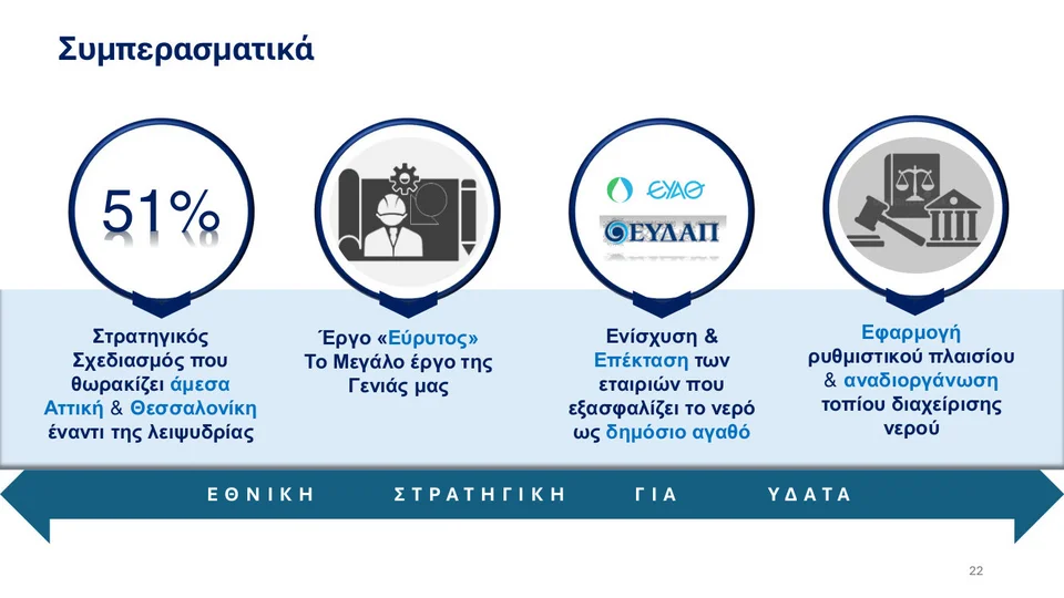 Ο κ. Παπασταύρου επανέλαβε ότι υπάρχει ένα συγκεκριμένο έργο, ο «Εύρυτος», που θωρακίζει την Αττική για τα επόμενα 30 έτη, κάτι που δημιουργεί έναν σαφή άξονα για την αντιμετώπιση της λειψυδρίας για τα επόμενα έτη.