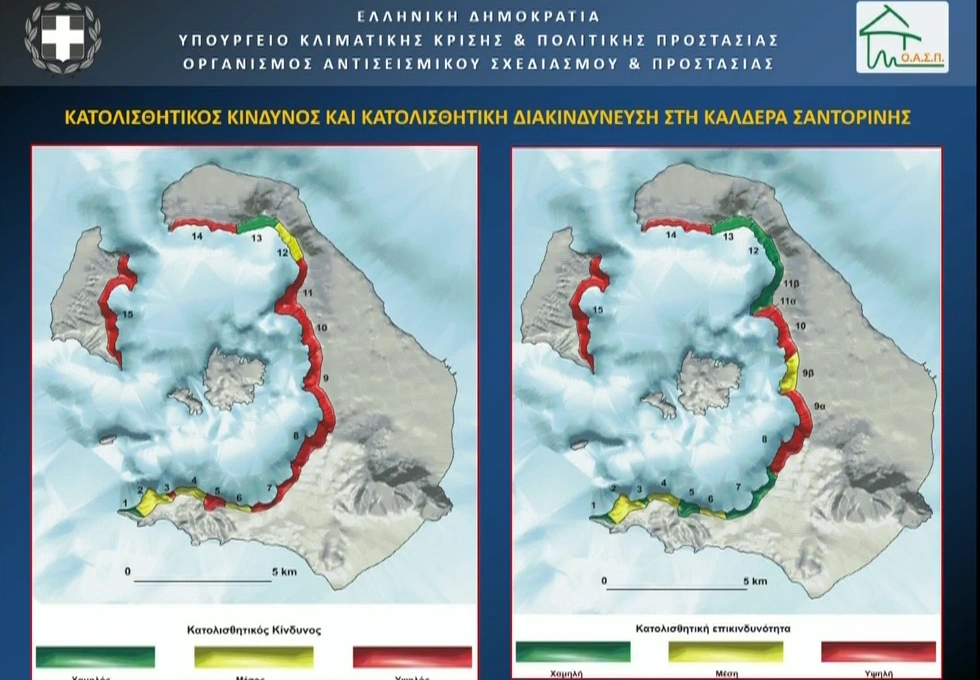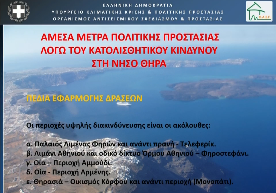 Ο κ. Λέκκας ανέφερε για τη Σαντορίνη ότι «είναι επόμενο οι κίνδυνοι κατολισθήσεων σε όλο το μήκος της καλντέρας να είναι υψηλός. Χαρτογραφήσαμε τα δεδομένα κι επιλέξαμε πέντε περιοχές για εφαρμογή μέτρων: Τον Παλαιό Λιμένα Φηρών, το Λιμάνι Αθηνιού και το οδικό δίκτυο του Όρμου, η Οία και συγκεκριμένα οι περιοχές Αμμούδι και Αρμένη και η Θηρασιά (οικισμός Κόρφου και ανάντι περιοχή, Μονοπάτι)».