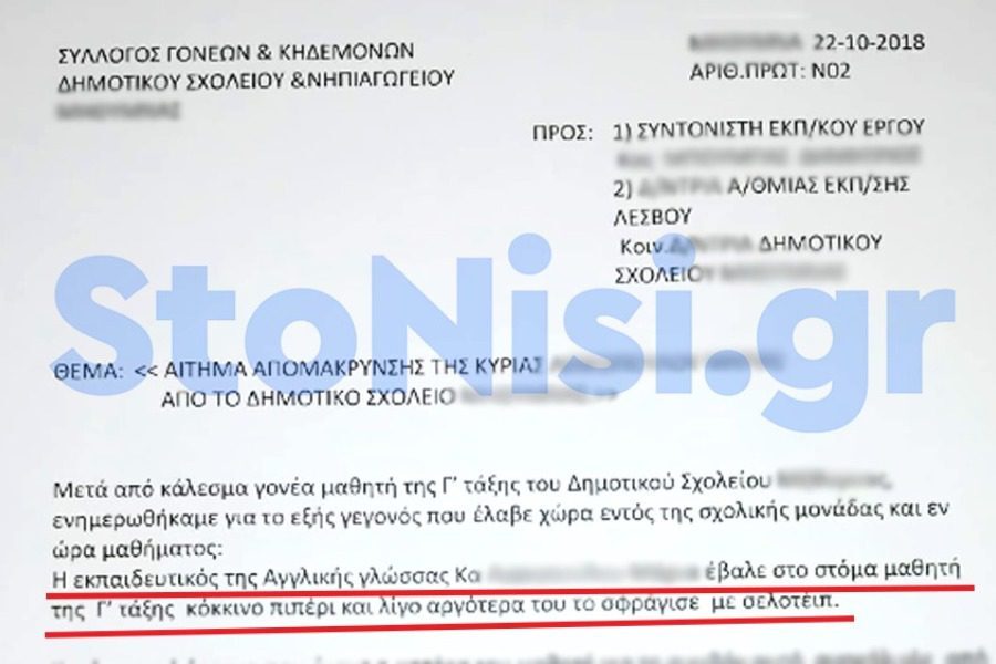 Το «Ν» φέρνει στο φως μία καταγγελία Συλλόγου Γονέων της Λέσβου το μακρινό 2018, όπου αναφέρεται ότι η ίδια καθηγήτρια σε μαθητή της Γ΄ Δημοτικού «έβαλε κόκκινο πιπέρι στο στόμα» του και «λίγο αργότερα του το σφράγισε με σελοτέιπ»!