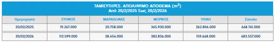 Απ: Τα αποθέματα της Παρασκευής 20 Φεβρουαρίου στους τέσσερις κύριους ταμιευτήρες της Αττικής (Μόρνος, Εύηνος, Υλίκη, Μαραθώνας) ανέρχονται σε περίπου 683,5 εκατ. κυβικά μέτρα. Η εικόνα είναι ελαφρώς βελτιωμένη σε σχέση με την αντίστοιχη περσινή περίοδο και αυτό οφείλεται στην πορεία των φετινών βροχοπτώσεων. Οι ιδιαίτερα αυξημένες βροχοπτώσεις στη Δυτική Στερεά Ελλάδα, ήδη από το φθινόπωρο, έδωσαν μια σημαντική «ανάσα», συμβάλλοντας στον ταχύτερο ρυθμό αναπλήρωσης των αποθεμάτων. Ενδεικτικά, στις περιοχές που τροφοδοτούν τους ταμιευτήρες Μόρνου-Ευήνου, τον Ιανουάριο σημειώθηκαν κατά τόπους ύψη βροχής υπερτριπλάσια του Ιανουαρίου 2025, ενώ για τον Φεβρουάριο οι καταγραφές δείχνουν ήδη ύψη ακόμα και πενταπλάσια από τα περσινά. Αυτό σημαίνει ότι για το επερχόμενο καλοκαίρι δεν αναμένεται άμεσος κίνδυνος για την υδατική μας επάρκεια.