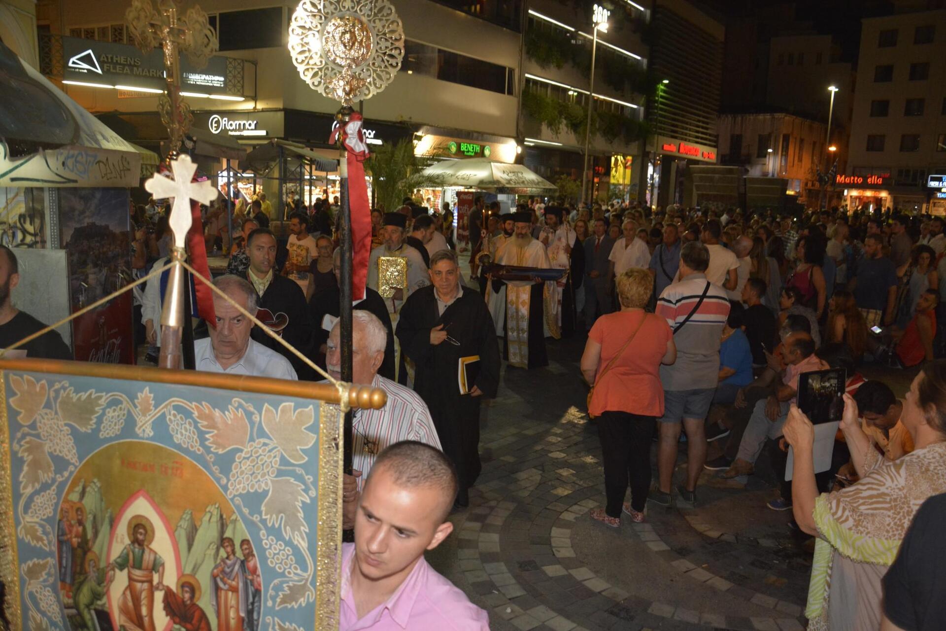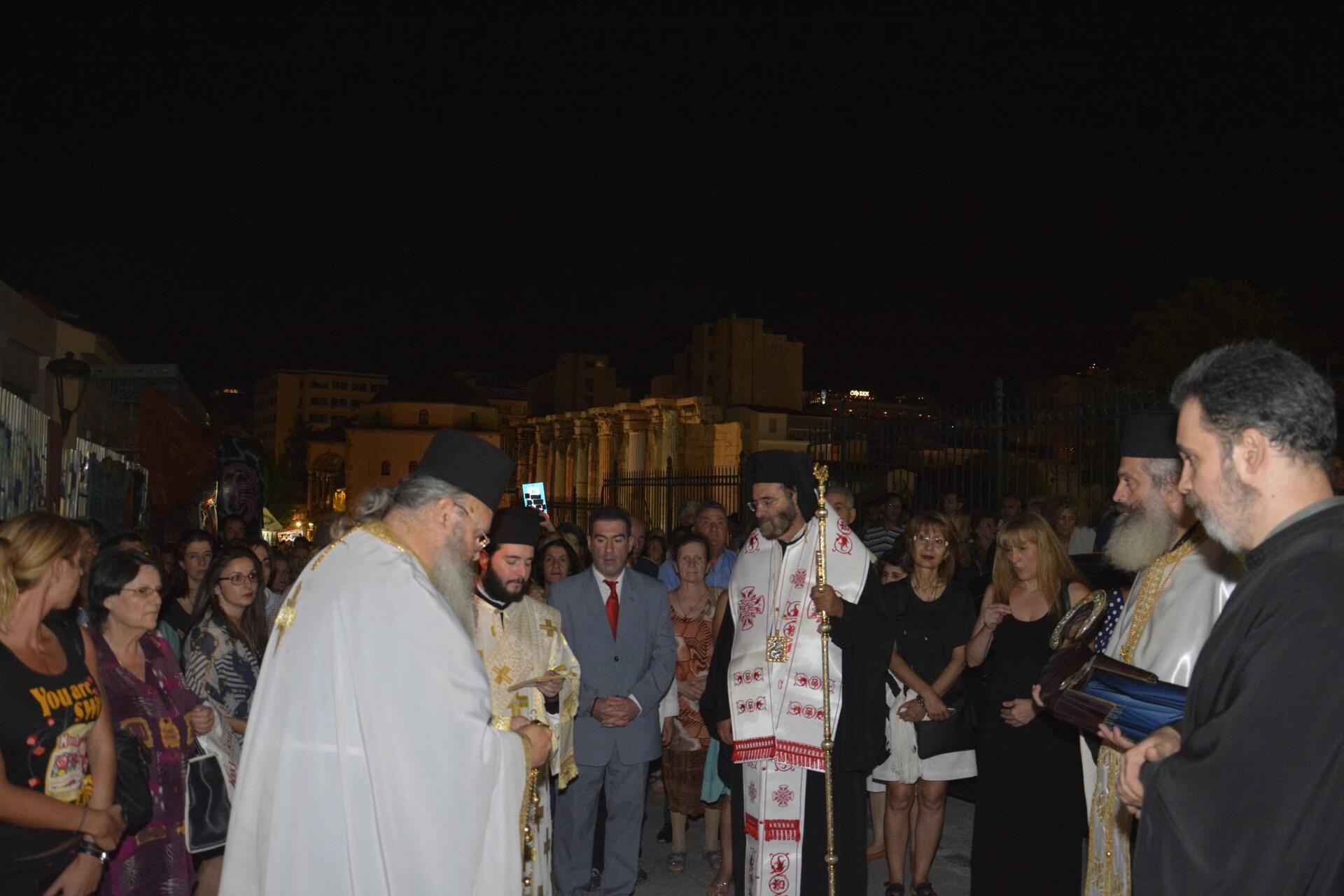 Ο Εσπερινός ολοκληρώθηκε αργά το βράδυ με την λιτάνευση της εικόνας της Κοιμήσεως της Θεοτόκου μέσα από δρομάκια της παλιάς Αθήνας και δίπλα από αρχαιολογικούς χώρους.
