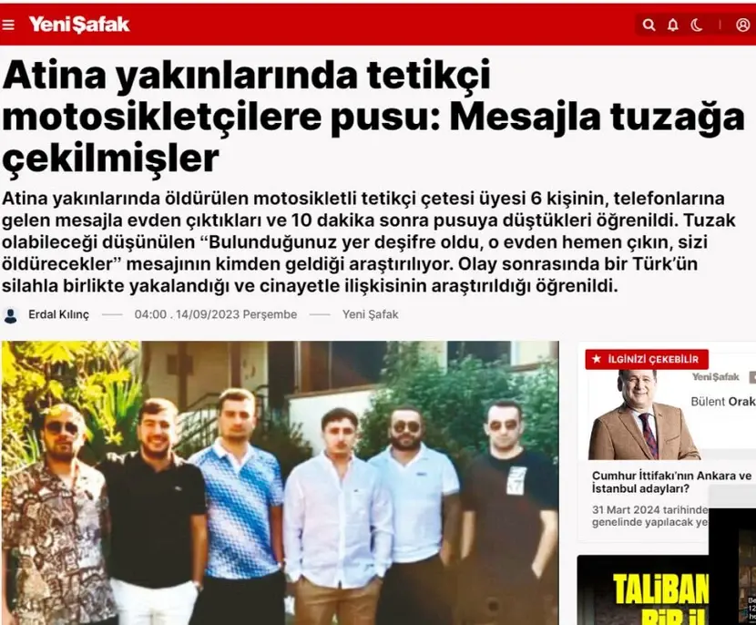 «Η έρευνα για τη δολοφονία 6 ανθρώπων κοντά στην Αθήνα, την πρωτεύουσα της Ελλάδας, συνεχίζεται. Οι ελληνικές μονάδες ασφαλείας μετέφεραν τα πτώματα στο νεκροτομείο της Ιατροδικαστικής Υπηρεσίας για νεκροψία. Πιστεύεται ότι οι 6 άνδρες του Barış Boyun, γνωστού ως αρχηγού της συμμορίας εκτελεστών με μοτοσικλέτες, αρχικά παρασύρθηκαν σε παγίδα και στη συνέχεια σκοτώθηκαν. 10 λεπτά πριν από την επίθεση κατά την οποία σκοτώθηκαν 6 άτομα, αποκαλύφθηκε ότι τα μέλη της συμμορίας έλαβαν ένα SMS στα τηλέφωνά τους που έλεγε: “Η θέση σας έχει αποκρυπτογραφηθεί, βγείτε αμέσως από αυτό το σπίτι, θα σας σκοτώσουν”. Κατόπιν αυτού, τα μέλη της συμμορίας έφυγαν από το σπίτι με το ίδιο όχημα και έπεσαν σε ενέδρα στο δρόμο. Σε διασταυρούμενα πυρά σκοτώθηκαν 6 άτομα από δύο επαγγελματίες. Διερευνάται ποιος έστειλε το μήνυμα, το οποίο ενδέχεται να είναι παγίδα», αναφέρει το τουρκικό δημοσίευμα.