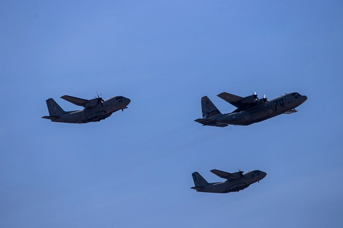 Συγκεκριμένα, λίγο μετά τις 15:00 μ.μ., αεροπλάνα και ελικόπτερα των Ενόπλων Δυνάμεων πέταξαν πάνω από τον ουρανό της Θεσσαλονίκης, μαγνητίζοντας τα βλέμματα των πολιτών.