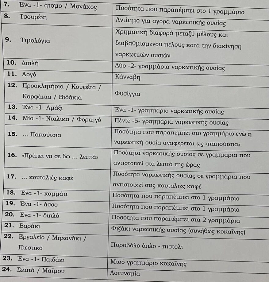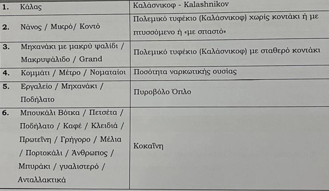 Σύμφωνα με τις αποκαλύψεις, οι λέξεις «νάνοι» χρησιμοποιούνταν για να περιγράψουν τα καλάσνικοφ χωρίς κοντάκι, ενώ τα «μέλια» αναφέρονταν στην κοκαΐνη.