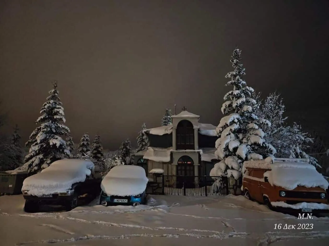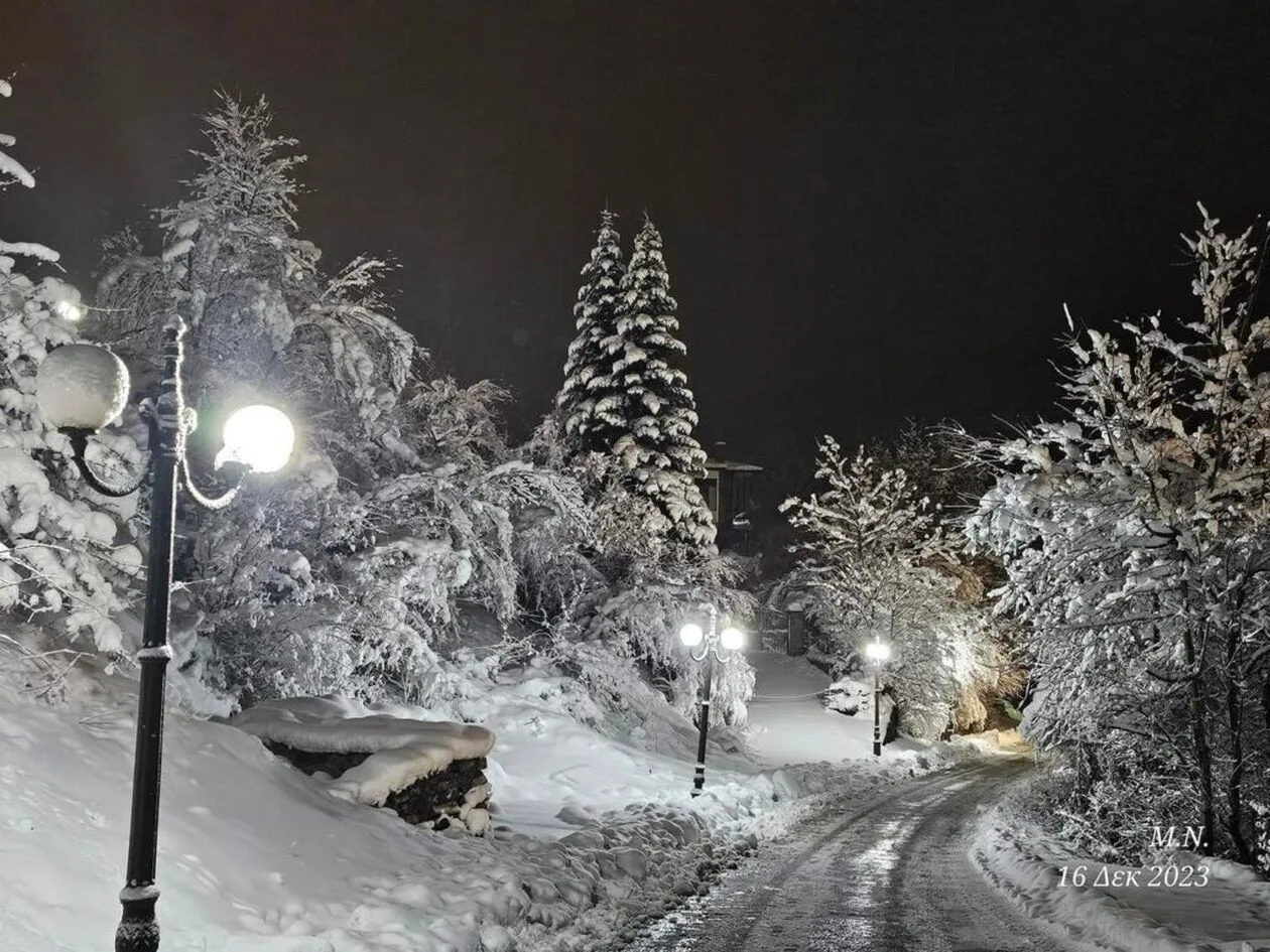 Τα βουνά χιονισμένα, το ίδιο και τα σπίτια και οι δρόμοι στη Μηλιά Μετσόβου.