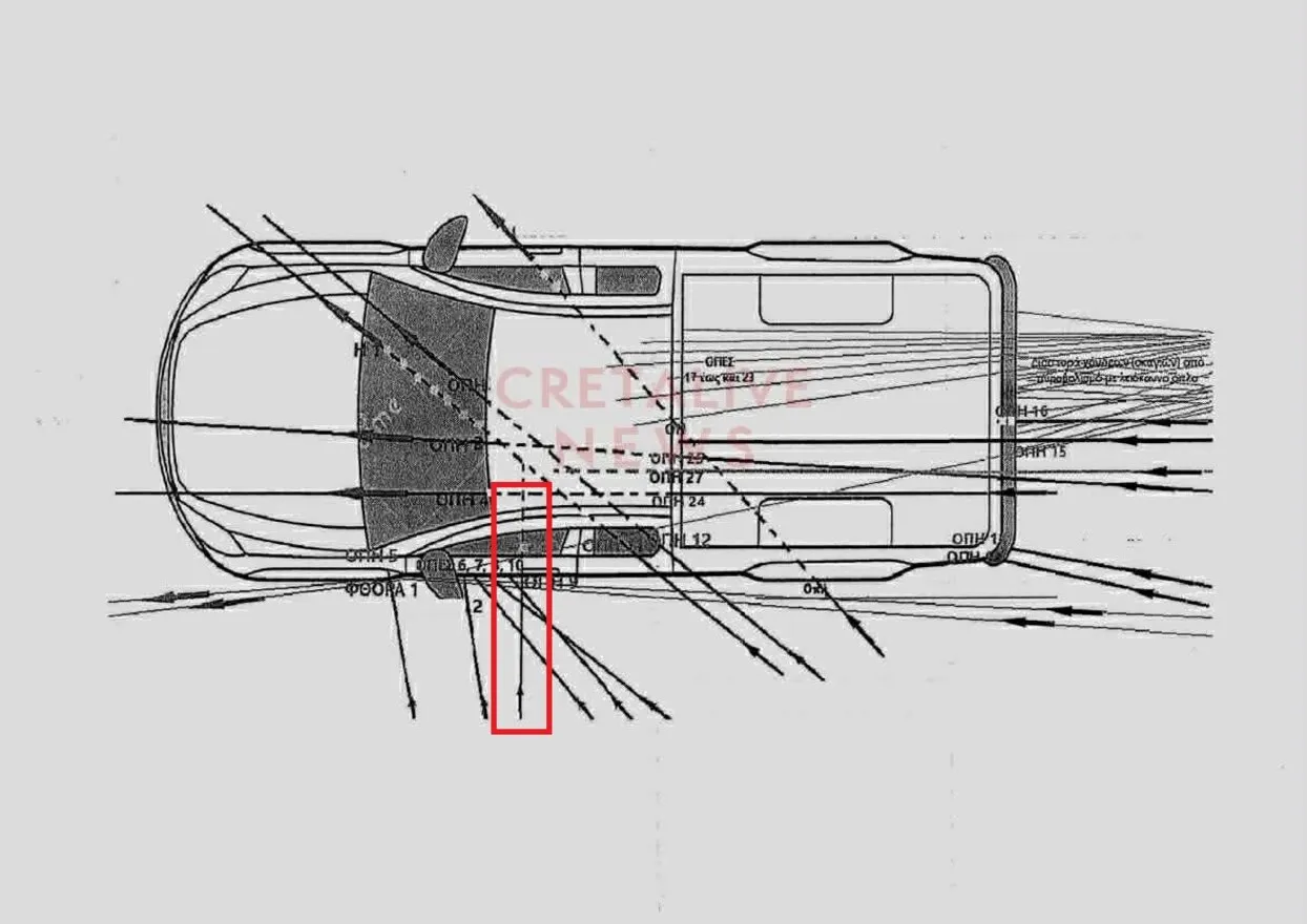 Η φονική βολίδα εισήλθε στην πόρτα του οδηγού σε σημείο πάνω από το χερούλι, σε ύψος περίπου 118,5 εκατοστών από το έδαφος. Και είναι μία βολίδα που καταγράφεται κάθετα ως προς την πόρτα του αυτοκινήτου, ενώ οι άλλες φαίνεται να έχουν ριφθεί υπό γωνία.