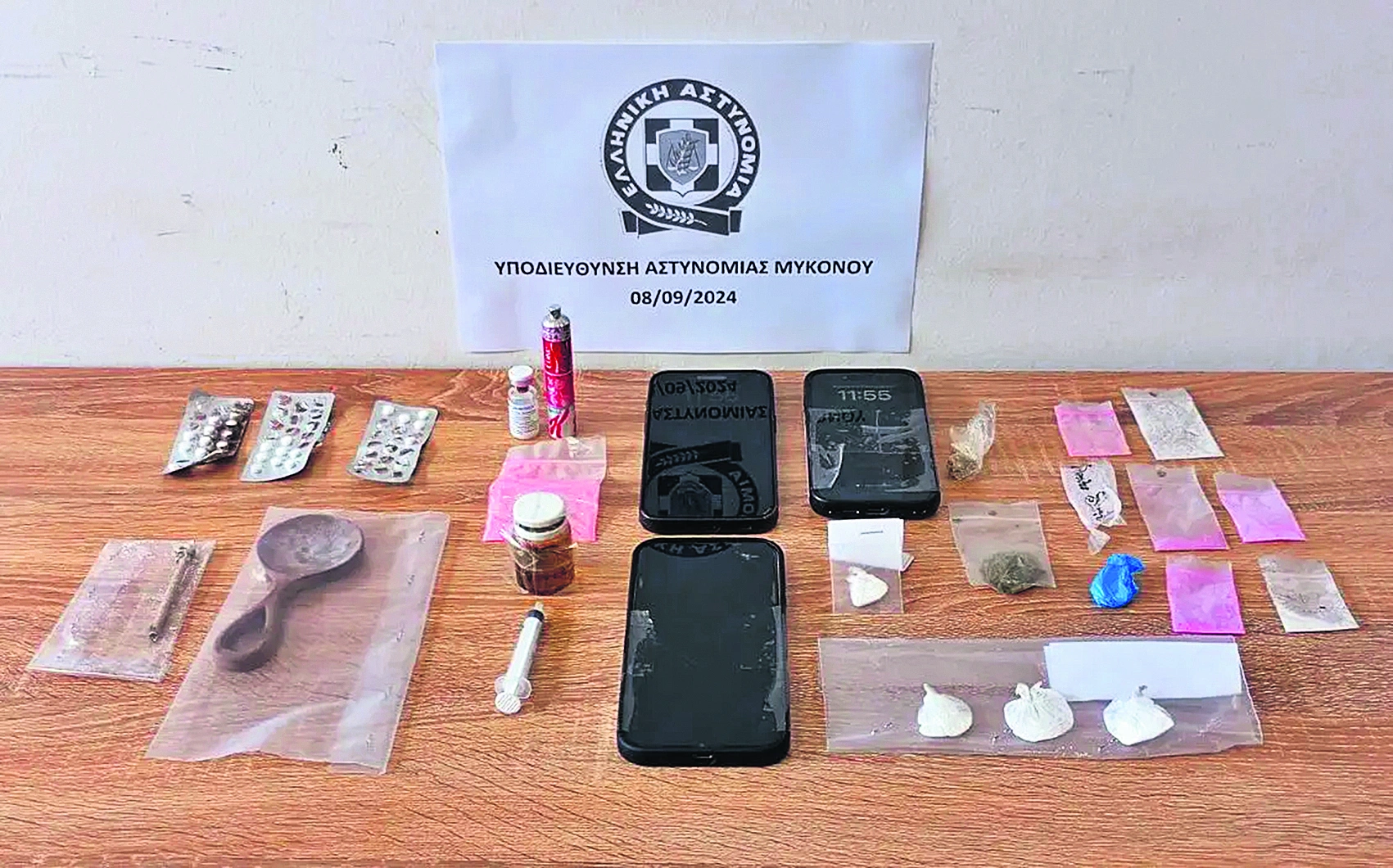 Στην κατοχή του βρέθηκαν τρεις αυτοσχέδιες συσκευασίες με μικροποσότητες κοκαΐνης. Συνελήφθη μαζί με τρία ακόμη άτομα, αλλά ο ίδιος και δύο ακόμη αφέθηκαν ελεύθεροι με προφορική εντολή του εισαγγελέα Πρωτοδικών Σύρου, καθώς ο ένας από αυτούς φαίνεται πως εμπορευόταν ναρκωτικές ουσίες σε θαμώνες πάρτι σε γνωστά καταστήματα και πολυτελείς οικίες της Μυκόνου. Στην κατοχή του διακινητή βρέθηκε και διάλειμμα GHB (Υδροξυβουτυρικό Οξύ), γνωστό ως «χάπι του βιασμού», ενώ στην κατοχή δύο από τους συλληφθέντες βρέθηκαν ποσότητες χασίς και ροζ κοκαΐνης.