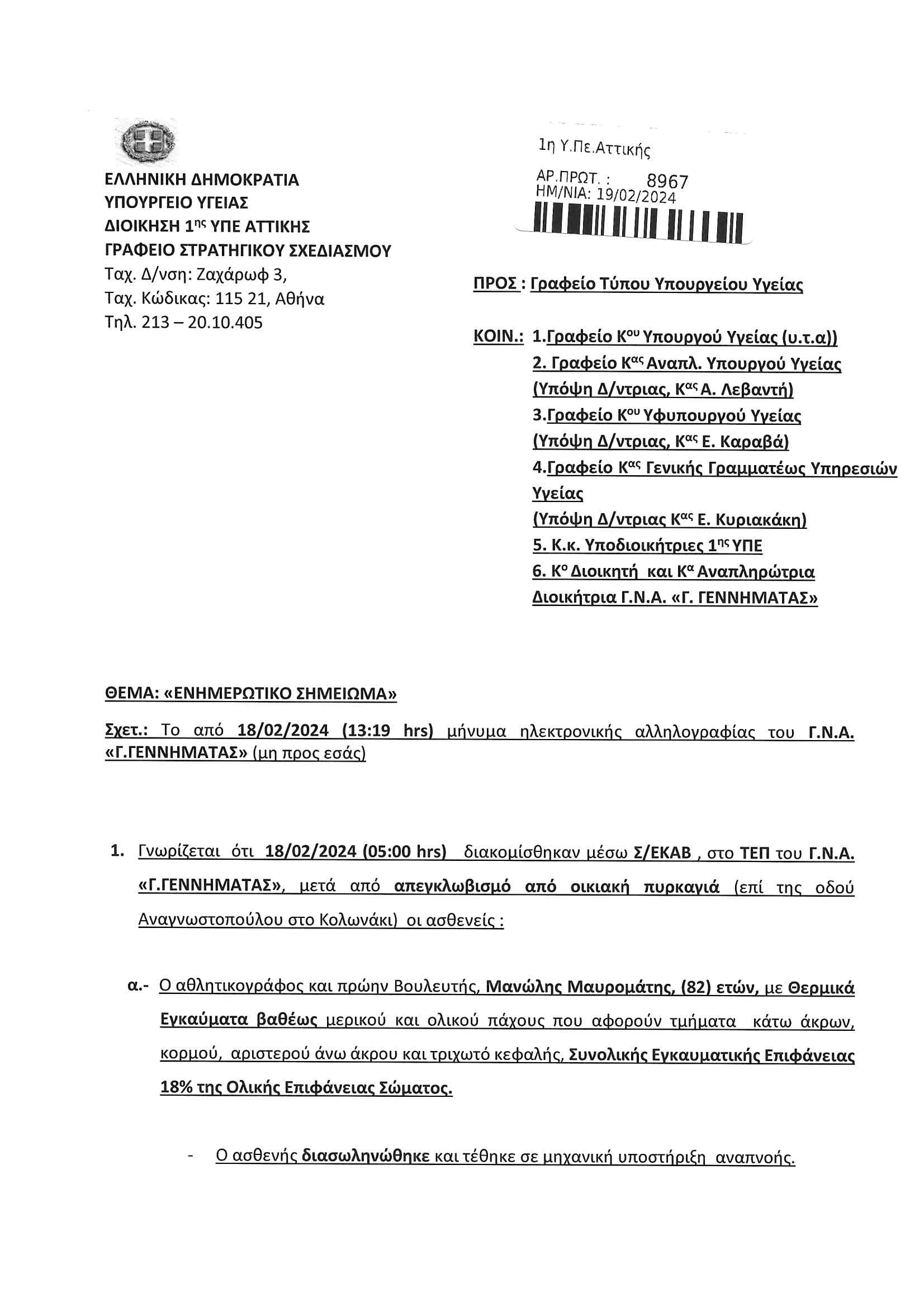 1. Γνωρίζεται ότι 18/02/2024 (05:00 hrs) διακομίσθηκαν μέσω Σ/ΕΚΑΒ , στο ΤΕΠ του Γ.Ν.Α. «Γ.ΓΕΝΝΗΜΑΤΑΣ», μετά από απεγκλωβισμό από οικιακή πυρκαγιά (επί της οδού Αναyνωστοπούλου στο Κολωνάκι) οι ασθενείς: