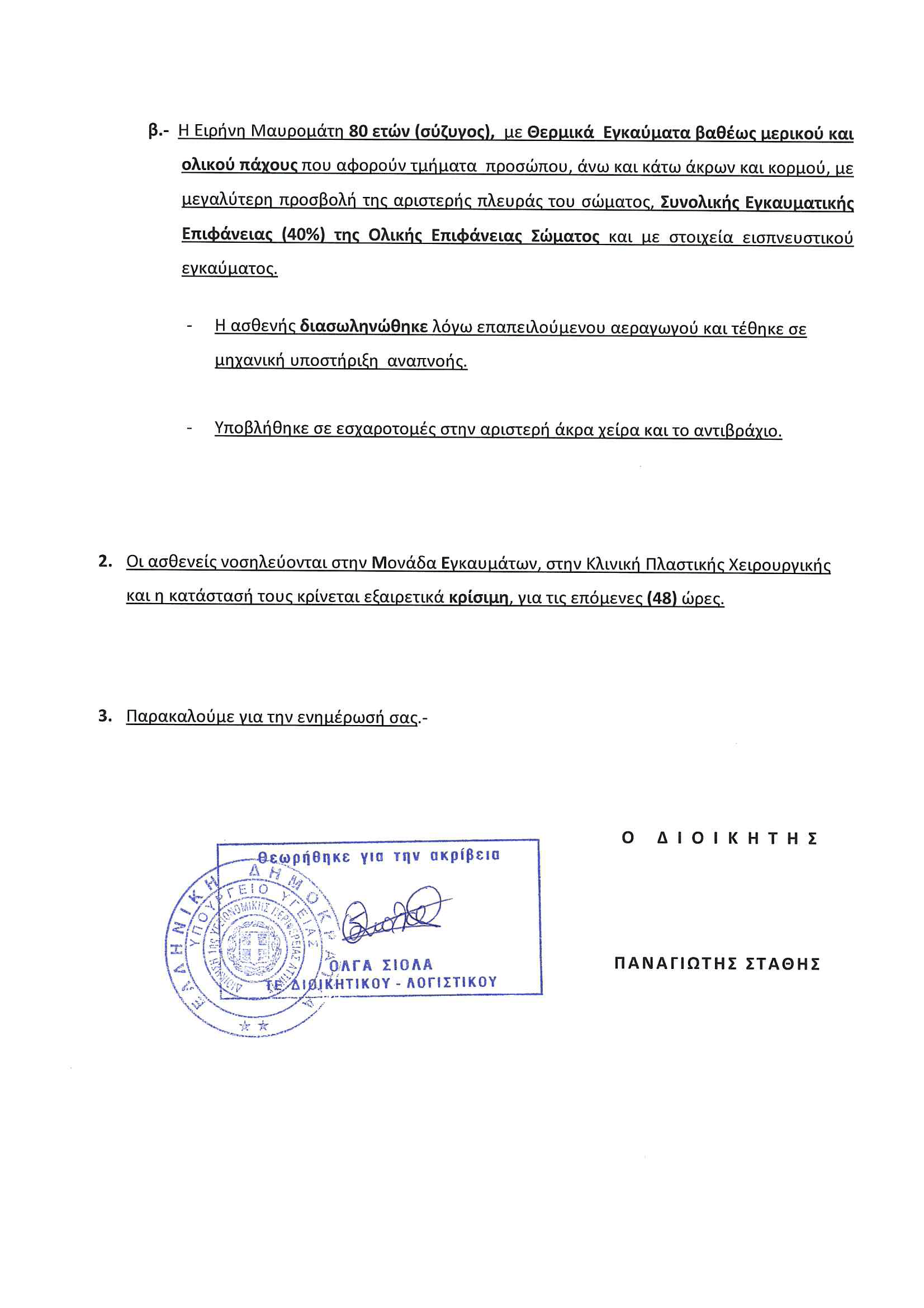 β.- Η Ειρήνη Μαυρομάτη 80 ετών (σύζυγος), με Θερμικά Εγκαύματα βαθέως μερικού και ολικού πάχους που αφορούν τμήματα προσώπου, άνω και κάτω άκρων και κορμού, με μεγαλύτερη προσβολή της αριστερής πλευράς του σώματος, Συνολικής Εγκαυματικής