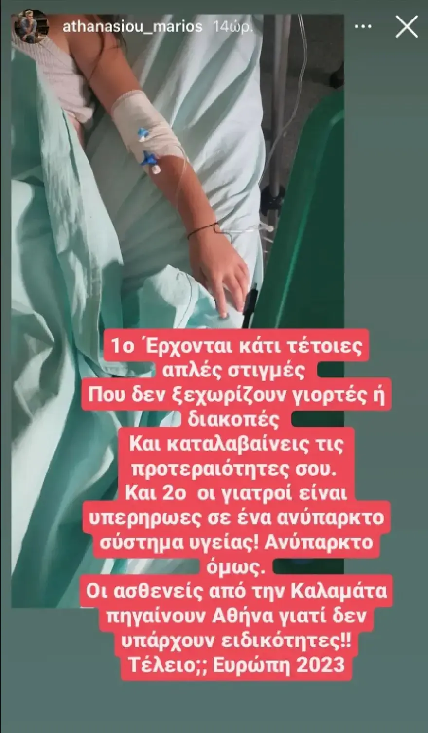 Πάνω στο στιγμιότυπο που ανάρτησε, ο ηθοποιός έγραψε: «1. Έρχονται κάτι τέτοιες απλές στιγμές που δεν ξεχωρίζουν γιορτές ή διακοπές και καταλαβαίνεις τις προτεραιότητές σου. 2. Οι γιατροί είναι υπερήρωες σε ένα ανύπαρκτο σύστημα υγείας. Ανύπαρκτο όμως. Οι ασθενείς από την Καλαμάτα πηγαίνουν Αθήνα γιατί δεν υπάρχουν ειδικότητες. Τέλειο; Ευρώπη 2023».