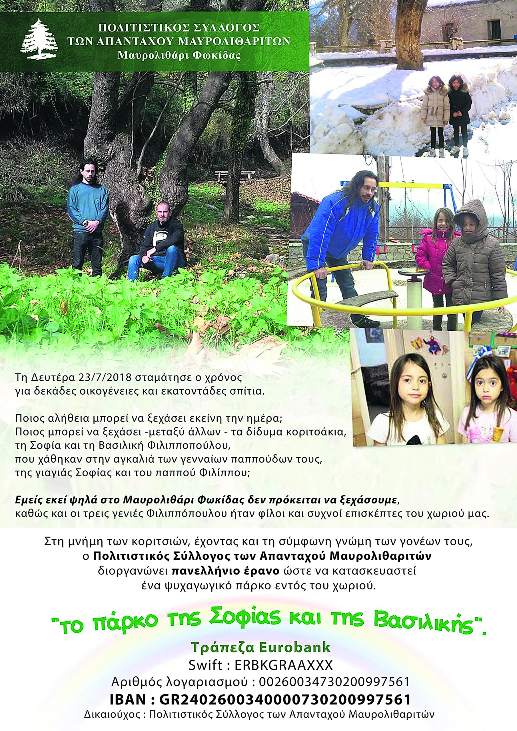 Ο Αγγελος Κοντοθάνος στάθηκε όχι μόνον φίλος αλλά αδελφός στην οικογένεια της Βασιλικής και της Σοφίας. Αλλωστε, η φιλία με τον πατέρα τους, Γιάννη Φιλιππόπουλο, κρατά εδώ και τριάντα χρόνια. Για να μείνει ζωντανή η μνήμη των εννιάχρονων κοριτσιών, αποφάσισε να φτιάξει ένα πάρκο στο καταπράσινο και χτισμένο στις πλαγιές του Οίτη, Μαυρολιθάρι, από όπου και κατάγεται ο ίδιος. Με τη σύμφωνη γνώμη του πατέρα, ο οποίος τότε στη φονική πυρκαγιά είχε συγκλονίσει τους πάντες στη προσπάθειά του να βρει τις δύο κόρες του.