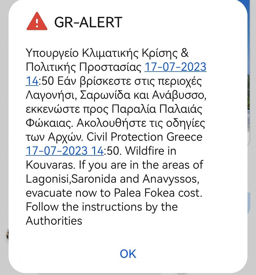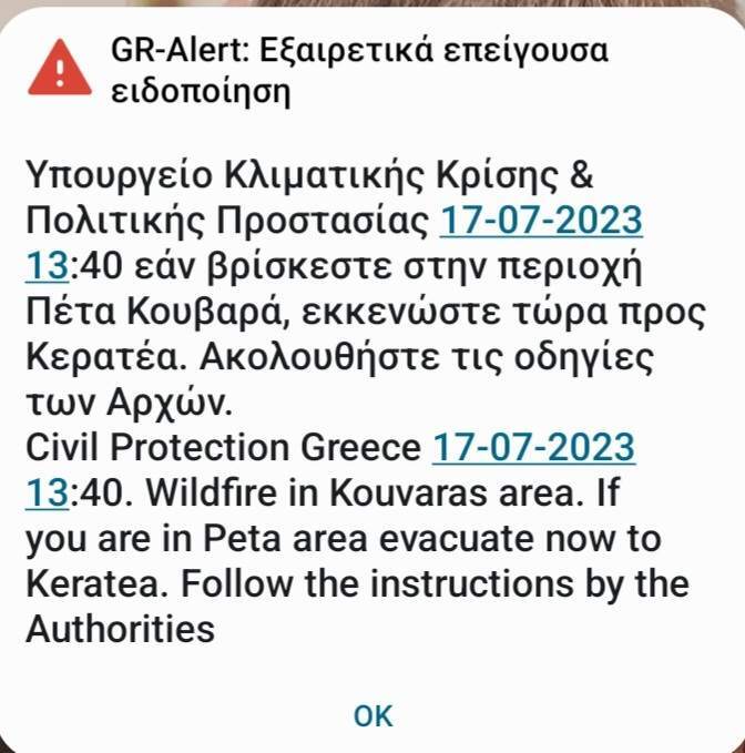 Λίγο πριν τις 14:00, εστάλη μήνυμα από το 112 για την εκκένωση της περιοχής Πέτα προς Κερατέα