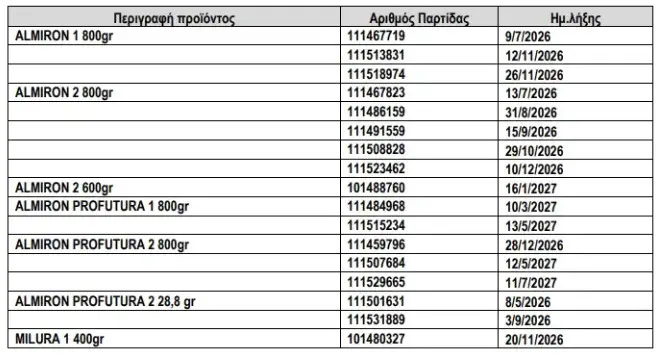 Δείτε τον πίνακα των παρτίδων που ανακαλούνται: