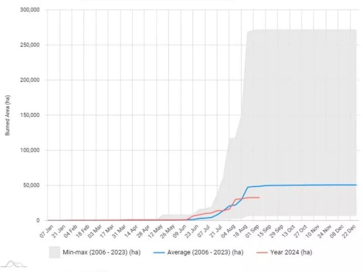 Μολονότι το φετινό καλοκαίρι χαρακτηρίστηκε από τις χειρότερες πυρομετεωρολογικές συνθήκες των τελευταίων 40 ετών, όπως έγραψε πρόσφατα ο διευθυντής του Εθνικού Αστεροσκοπείου Αθηνών Μανώλης Πλειώνης, οι καμένες εκτάσεις από τις αρχές του έτους υπολογίζονται σε περίπου 326.840 στρέμματα, ενώ ο μέσος όρος της περιόδου 2006-2023 έως τις 8 Σεπτεμβρίου ανέρχεται σε 488.440 στρέμματα.