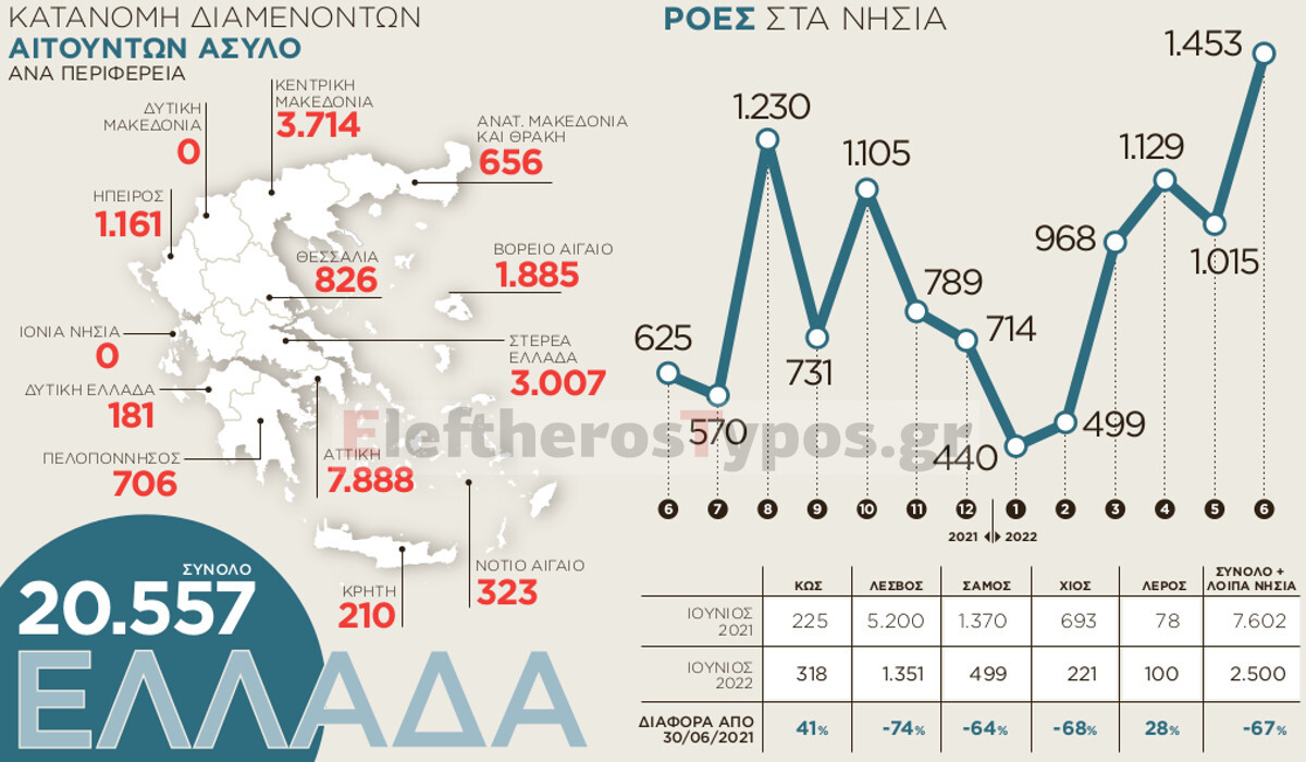 Σύμφωνα με το ενημερωτικό δελτίο του Ιουνίου, οι ροές κατά το 1ο εξάμηνο του 2022 παρουσιάζονται αυξημένες κατά 28% στα νησιά και κατά 23% στο σύνολο, σε σχέση με το 1ο τετράμηνο του 2021. Μετά από συστηματικές προσπάθειες, τον 6ο μήνα του 2022, 604 άτομα αναχώρησαν με προορισμό είτε την Ευρώπη είτε τρίτα κράτη μέσω των μηχανισμών απελάσεων, επιστροφών και μετεγκαταστάσεων υπηκόων τρίτων χωρών, ενώ στη χώρα μας αφίχθησαν 1.129 άτομα.