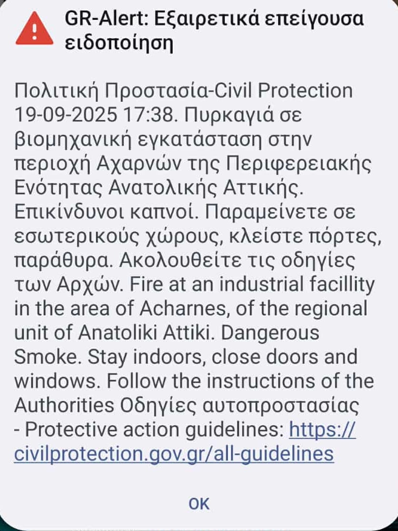 Εκδόθηκε μήνυμα 112 στους κατοίκους ώστε να παραμείνουν σε κλειστούς χώρους και να κλείσουν πόρτες και παράθυρα.