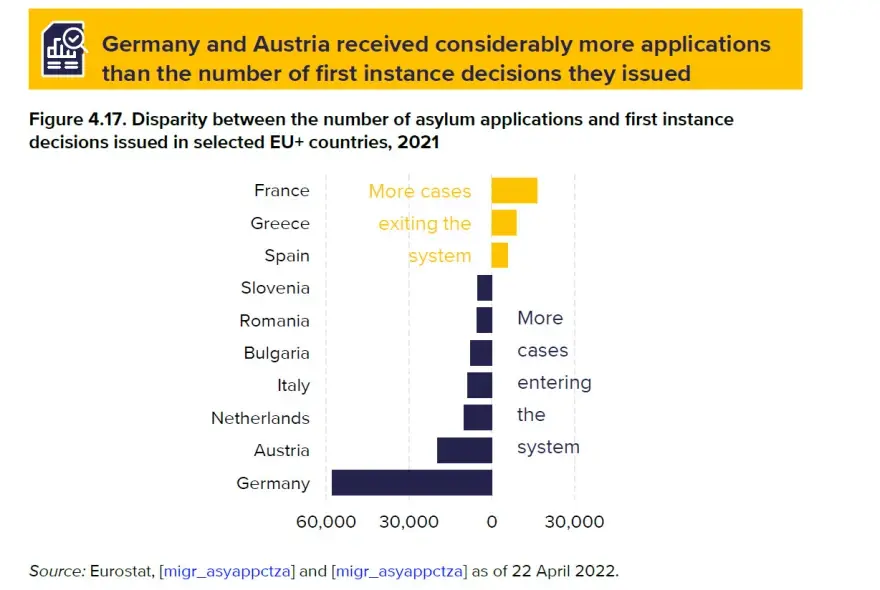 Ωστόσο, παρά τη σταθερή λήψη αποφάσεων μεταξύ 2020 και 2021, η Γερμανία είχε τη μεγαλύτερη υπέρβαση εισροής (αιτήσεις που υποβλήθηκαν) σε σχέση με τις πρωτοβάθμιες αποφάσεις, ακολουθούμενη με διαφορά από την Αυστρία και την Ολλανδία. Στη συντριπτική πλειοψηφία των χωρών της ΕΕ ο αριθμός των αιτήσεων που υποβλήθηκαν υπερτερούσε των αποφάσεων που εκδόθηκαν το 2021.