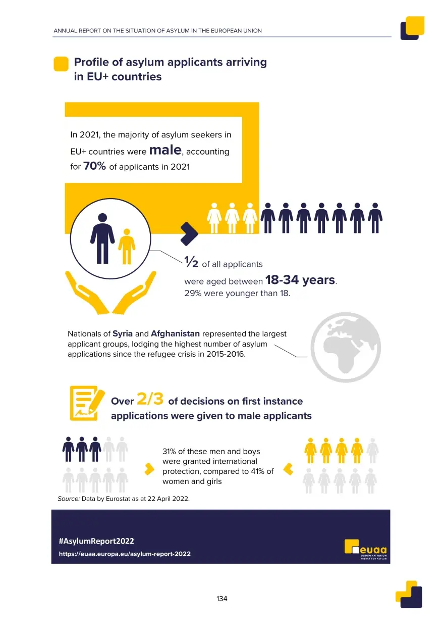 Συνολικά, περίπου οι μισές αποφάσεις σε πρώτο βαθμό εκδόθηκαν σε ενήλικες ηλικίας 18 έως 34 ετών. Πάνω από το ένα τέταρτο όλων των αποφάσεων το 2021 εκδόθηκαν σε ανηλίκους, με παιδιά από τη Συρία και το Αφγανιστάν να αντιπροσωπεύουν από κοινού πάνω από το ένα τρίτο αυτών κάτω των 18 ετών. Οι αποφάσεις που εκδόθηκαν για ανήλικους Σύρους μειώθηκαν κατά 15% το 2021, αλλά υπήρξε συγκρίσιμη αύξηση σε αποφάσεις που εκδίδονται σε ανήλικους Αφγανούς. Άλλες κύριες ομάδες εθνικοτήτων για ανηλίκους το 2021 περιελάμβαναν Ιρακινούς, Νιγηριανούς και Ερυθραίους (με φθίνουσα σειρά).