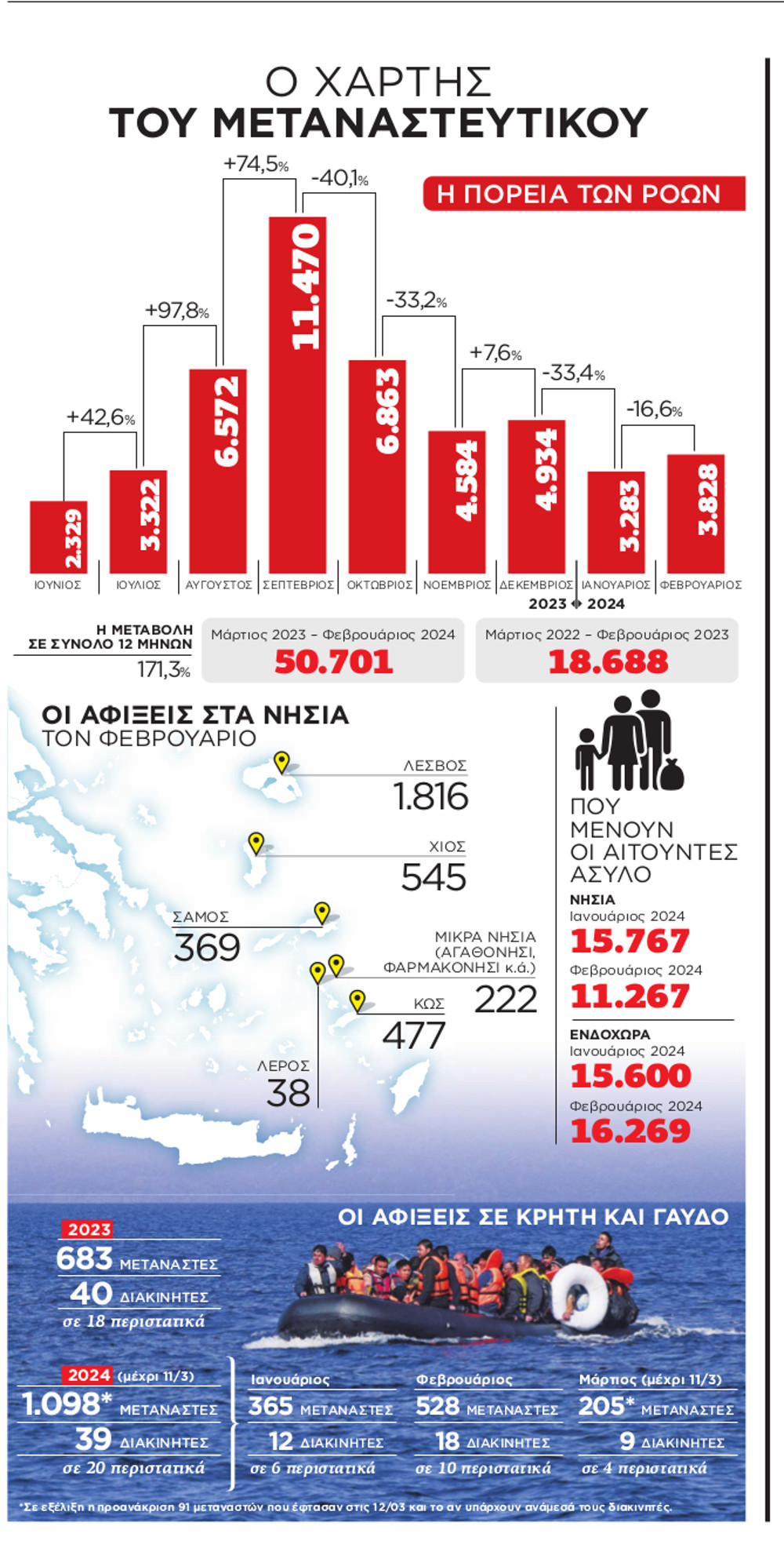 Αυτό που ωστόσο είναι δεδομένο είναι η εντυπωσιακή αύξηση των ροών μέσα στο 12μηνο που δείχνει ότι η κίνηση πληθυσμών είναι αυξημένη. Από τον Μάρτιο του 2023 μέχρι τον Φεβρουάριο του 2024, 50.000 μετανάστες και πρόσφυγες ήρθαν από τα τουρκικά παράλια σε σχέση με τους μόλις 18.000 το ίδιο χρονικό διάστημα το 2022-2023 καταγράφοντας αύξηση που ξεπερνά το 170%. Και όλα αυτά, με δεδομένο τις καλές σχέσεις γειτονίας με την Τουρκία από τον Οκτώβριο στο μεταναστευτικό και τον ανοικτό δίαυλο επικοινωνίας των δύο Λιμενικών Σωμάτων.