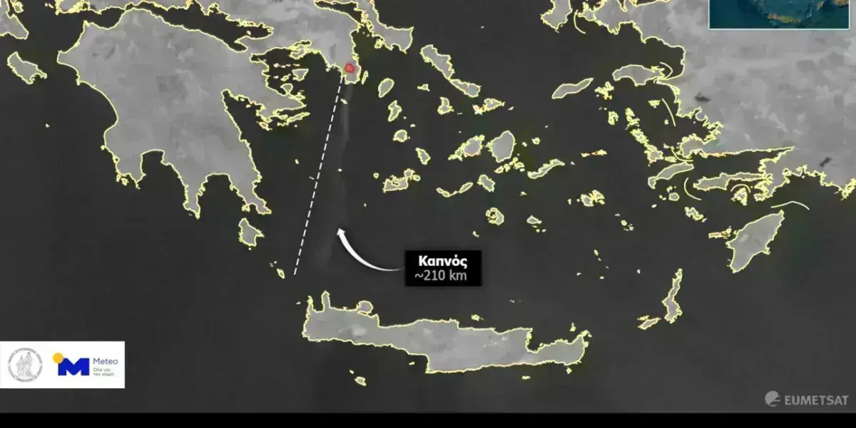Σύμφωνα με τη δορυφορική εικόνα που δημοσίευσε το meteo λίγο μετά τις 3 το μεσημέρι ο καπνός φαίνεται να έχει «ταξιδέψει» σε απόσταση μεγαλύτερη των 210 χιλιομέτρων νότια. Εχει φτάσει στα Αντικύθηρα και πλέον πλησιάζει την Κρήτη.