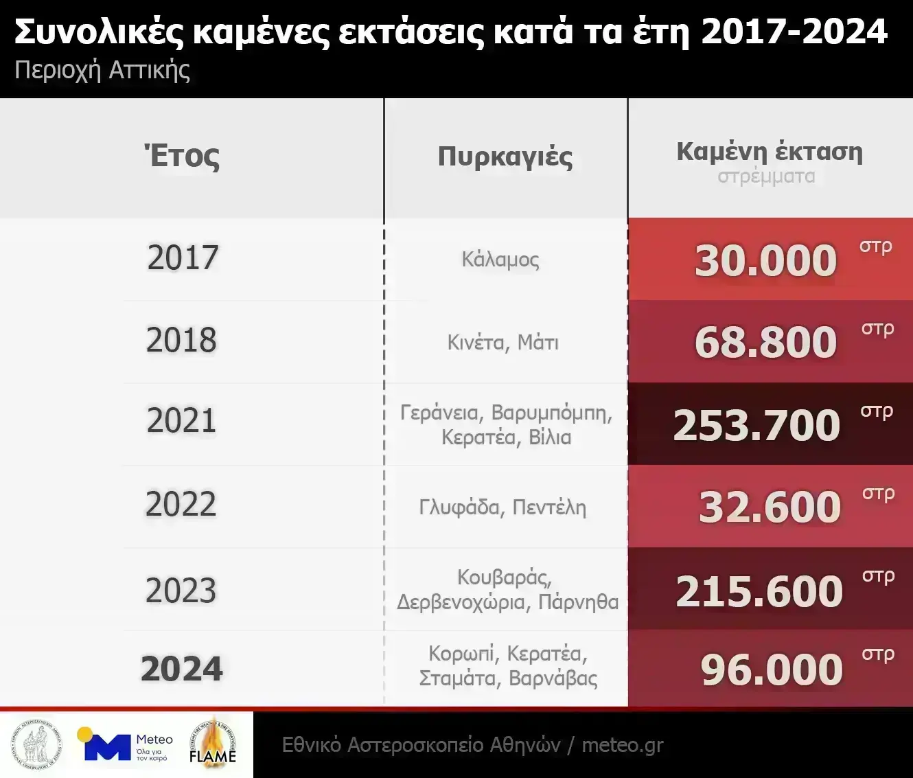 Η συνολική επιφάνεια της Περιφέρειας Αττικής (χωρίς την περιοχή της Τροιζηνίας, των νησιών και του Λεκανοπεδίου) είναι 2.500.000 στρέμματα, οπότε τα τελευταία 8 έτη το 26% της συνολικής επιφάνειας έχει καεί από δασικές πυρκαγιές. Στην Περιφέρεια Αττικής η επιφάνεια των δασικών εκτάσεων είναι περίπου 1.230.000 στρέμματα και τα τελευταία 8 χρόνια έχουν καεί 450.000 στρέμματα δάσους, δηλαδή το 37% της επιφάνειας των δασών. Η πρόσφατη πυρκαγιά που ξεκίνησε από τον Βαρνάβα Αττικής και έφτασε μέχρι την οικιστική ζώνη του Λεκανοπεδίου, έκαψε ένα μεγάλο τμήμα δασικής έκτασης της Βορειοανατολικής Αττικής.