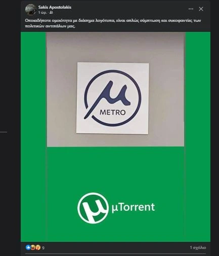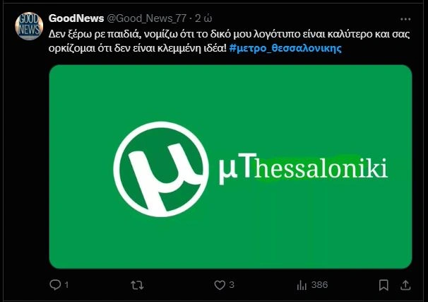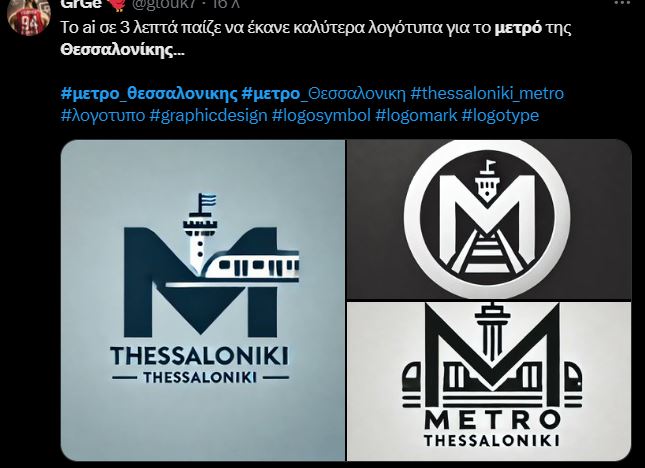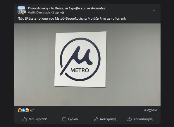«Πώς βλέπετε το logo του μετρό Θεσσαλονίκης; Μοιάζει λίγο με torrent;» ρωτάει ένας χρήστης του Facebook για το νέο λογότυπο, ενώ ακόμη ένας αναφέρει στον προσωπικό του λογαριασμό στο «Χ» πως «Το AI σε 3 λεπτά παίζει να έκανε καλύτερα λογότυπα για το Μετρό της Θεσσαλονίκης…».