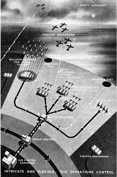Ίσως το χαρακτηριστικότερο παράδειγμα συστήματος που κλήθηκε να κάνει κάτι ανάλογο με την «Ασπίδα του Αχιλλέα» είναι το σύστημα Διοίκησης και Ελέγχου (Dowding system) που ανέπτυξε η Βρετανική Αεροπορία (Royal Air Force- RAF) λίγο πριν τον 2ο Παγκόσμιο Πόλεμο, και το οποίο χρησιμοποιήθηκε με επιτυχία στη μάχη της Αγγλίας. Είναι γεγονός ότι ο περισσότερος κόσμος, από την Μάχη της Αγγλίας, ανακαλεί τα (ομολογουμένως πρωτοπόρα) συστήματα ραντάρ (Chain Home) και τους (ομολογουμένως ηρωικούς) πιλότους της RAF, και ελάχιστοι γνωρίζουν για το Dowding system. Η σημασία του ήταν θεμελιώδης, και δεν είναι τυχαίο ότι αποτέλεσε την μήτρα για όλα τα σύγχρονα συστήματα αεράμυνας μέχρι τις μέρες μας. Η εικόνα παρακάτω δείχνει πόσο σημαντική ήταν η ροή δεδομένων προς το κέντρο, η λήψη αποφάσεων και η μεταβίβαση των αποφάσεων στους επιμέρους σχηματισμούς, κάνοντας ταυτόχρονα διαχείριση κινδύνου, αλλά και αποβλέποντας στην βέλτιστη λύση στο συσχετισμό κόστους- αποτελέσματος.
