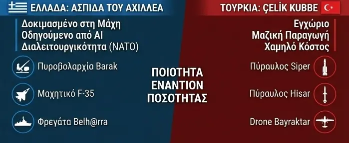 Η σύγκριση ανάμεσα στην ελληνική «Ασπίδα του Αχιλλέα» και τον τουρκικό «Χαλύβδινο Θόλο» (Çelik Kubbe) είναι εξαιρετικά ενδιαφέρουσα, καθώς αποκαλύπτει δύο διαφορετικές στρατηγικές προσεγγίσεις για το ίδιο ακριβώς πρόβλημα: την κυριαρχία στους αιθέρες μέσω της τεχνολογίας. Ενώ ο στόχος είναι κοινός (ένα πολυεπίπεδο δίχτυ προστασίας), η φιλοσοφία πίσω από την υλοποίησή τους διαφέρει σημαντικά.