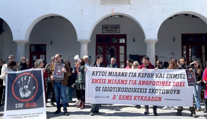 Το κάλεσμα της εν λόγω διαμαρτυρίας έκαναν οι σύλλογοι των αρχαιολόγων και των εργαζομένων στο υπουργείο Πολιτισμού, μετά τον μαφιόζικο ξυλοδαρμό του αρχαιολόγου Μανώλη Ψαρρού. Την συγκεκριμένη κινητοποίηση στηρίζει τόσο ο δήμαρχος, Κωνσταντίνος Κουκάς ο οποίος βρίσκεται στο σημείο με τους διαδηλωτές, ενώ μαζί τους βρίσκονται και εκπαιδευτικοί του νησιού, εκπρόσωποι επιχειρήσεων αλλά και κάτοικοι της Μυκόνου. Κεντρικό σύνθημα της διαμαρτυρίας ήταν «Έξω η Μαφία από το νησί».