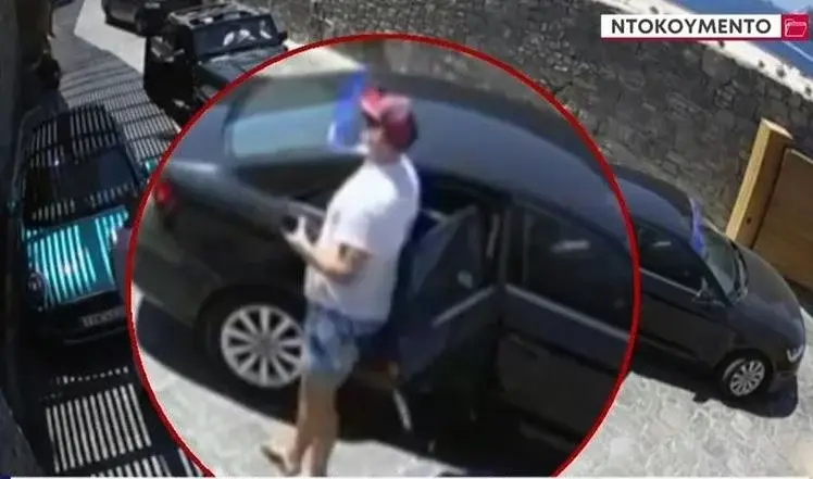 Όπως αποτυπώνεται στο σχετικό βίντεο, η είσοδός του στο δωμάτιο έγινε την 13:24, χωρίς να φέρει αντικείμενα, ενώ κατά την έξοδό του, τρία λεπτά αργότερα (13:27), έχει σακίδιο πλάτης σκούρου χρώματος. Στις 13:50 μετέβη στον χώρο στάθμευσης του ξενοδοχείου και τον παρέλαβε όχημα (τύπου VAN) μεταφοράς τουριστών με κατεύθυνση προς τη Χώρα Μυκόνου.