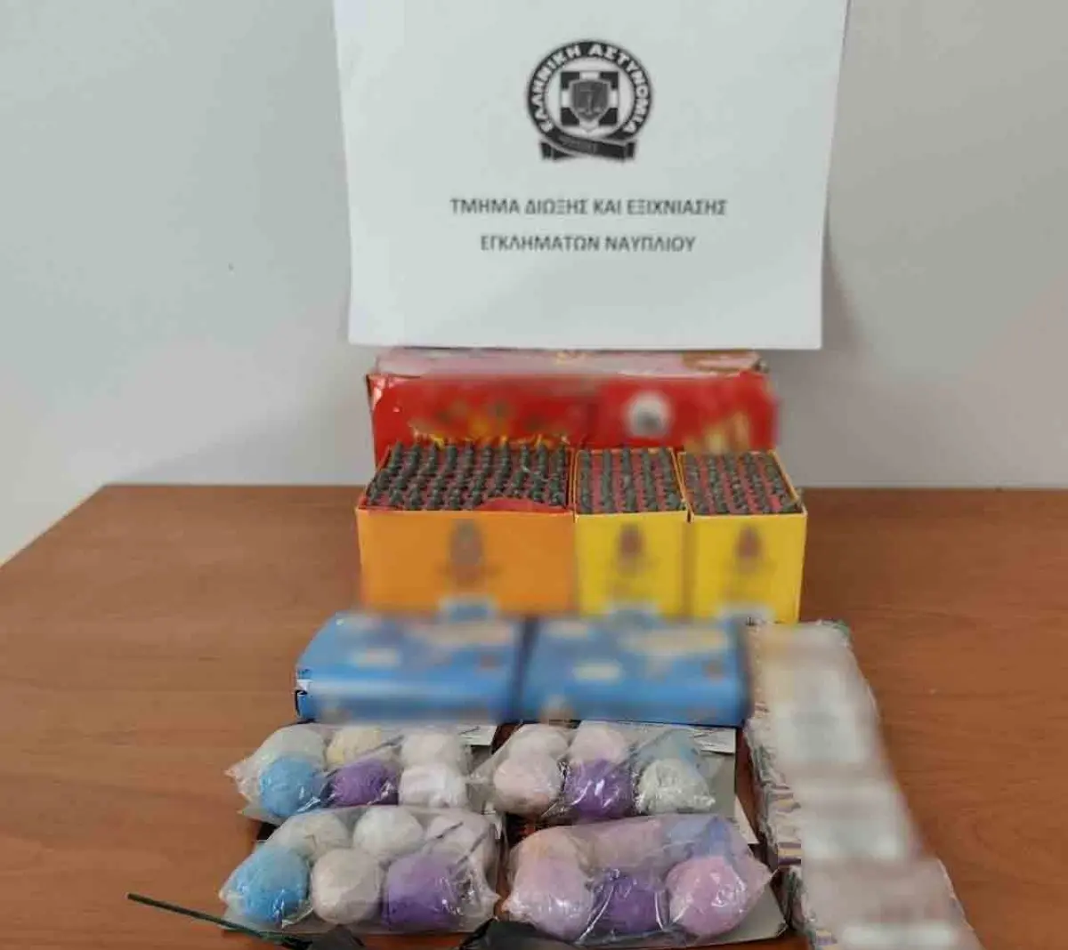 Στους δύο ελεγχόμενους χώρους οι αστυνομικοί εντόπισαν μεγάλο αριθμό από παράνομα είδη. Συγκεκριμένα βρήκαν και κατέσχεσαν δύο κροτίδες και 57 τεμάχια πυροτεχνικών παιδικών αθυρμάτων διαφόρων τύπων καθώς και 200 τεμάχια βολών από πυροτεχνήματα. Όλα τα παράνομα υλικά κατασχέθηκαν από τις αστυνομικές αρχές του Ναυπλίου. Η 55χρονη κρατείται και αντιμετωπίζει τις συνέπειες του νόμου μετά την ολοκλήρωση της επιχείρησης.